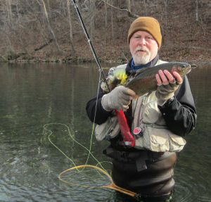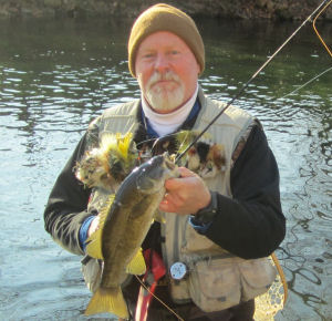Saturday found the 4 of us up early with anticipation of yet another day of fishing…it would be a day of dowsing the fly rod as the temps had fallen to about 22 degrees and the eyelets of our fly rods would quickly freeze, as would the reel, the only way to relieve the problem was to dip the entire package into the 56 degree spring water…and then start all over again. Seldom does it all come together but this was one of those days, the stream was basically wide open and the trout were eager to please; by noon I had landed another 30 fish and made my way back upstream to check in on the others. After a sandwich, chips and a fresh cupcake, dad and I drove down to the confluence of the spring and the Niangua River. I swapped out my 6 weight for my 3 weight smallmouth rig and started making casts downstream, jigging my yellow shiner back upstream in search of a Missouri bronzeback. On my third cast I let my fly sink several feet and started slowly jigging it back towards me when I felt a jab on the other end, a quick strip set and a few seconds later I lipped a healthy 15 inch smallmouth that really made the day.