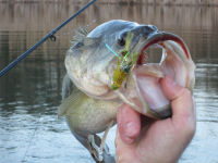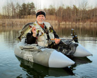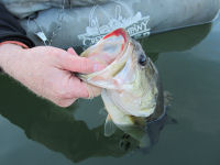 I was the first one off and was kicking backwards at a pretty good rate with my 6 weight in hand and was using my streamer express line that has a sinking front portion and a rear floating portion…the front portion which is black in color sinks at a high rate, approximately 5 to 6 inches per second and will get a fly down deep and pretty quickly, that is where the fish were hanging out. I had gone about halfway down the lake before I had my first take; the fly was deep and I was making very slow strips back towards me when I felt a tug and quickly gave a strip set. I felt pressure and in a second I could see my line moving; moments later I landed my first ever bass from a float tube in January, a nice 15 incher that appeared pretty lethargic and frankly didn’t put up much of a battle. The next cast resulted in a 10 inch white crappie that fought about as hard as the much larger bass.