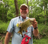 When I got to the first big hole I eased around and placed myself below the fish. I tied on a black and yellow ant in size 8 and made a cast above the hole allowing the bug to dead drift into the hole. On the first cast I saw a flash in the water, always a good sign. On my second cast I watched as the bug entered the hole and the end of my fly line stopped and dipped; I quickly set the hook on a fat smallie and the battle was on. I was not sure how my new rod would handle the stress of this strong fish and I quickly got all my fly line on the reel and allowed the drag to do its job. This fatty was not happy to have been hooked and he put up a fight of about 2 minutes before I backed him up and was able to lip a 15 inch smallmouth that had to weigh 2 ½ pounds. I snapped a few photos and it was at that moment that in my ears was ringing a familiar song…it was Brad Paisley’s “I’m Still A Guy” and I had to laugh because for those of you that know the lyrics there is a portion that talks to the gal seeing a beautiful lake for a picnic and the guy seeing a largemouth up under the log. I hit replay and listened to the familiar lyrics and had a humorous moment all on my own as the song nailed my relationship with Vickie and probably for many of our ‘guy’ readers…as they have a similar relationship with their significant other. To each their own….but I know I am still a guy and landing the several smallies on this glorious afternoon was special; so guys, get out there and get going as that big fish up under that log is waiting for you as we all Enjoy the Great Outdoors.