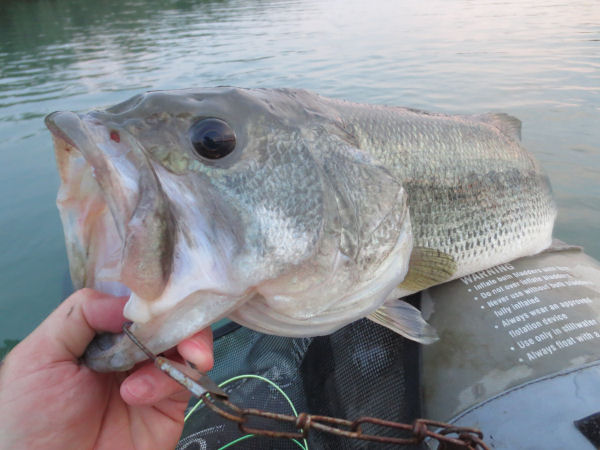 I had went about a half an hour when I had my first hook-up…it was a big bass, but it spit the hook before I could land him. This success told me that I was on the right track. A few casts later and once again I felt a big tug on the other end and quickly strip set on what would be a 22 inch largemouth bass. The fish put up a good fight but with my 10-weight in hand it wasn’t too much of a contest. I ‘lipped’ the bass and placed him on my stringer, took a few photos then released him safely back into the depths he had come from.