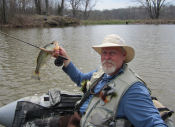 I was back at my tree top where I caught the large red ear; I made a cast right in front of the downed limb and had made two strips when a big crappie came up out of the water…and when it did I could clearly see my white streamer in its mouth. I set the hook and the battle was on. I knew this was a very good fish and it would make my fourth specie and so I was more cautious than usual and it all paid off as I landed a 15 inch black crappie….and had completed my farm pond slam.