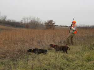 I met Jim at the McDonalds in Attica at 7:45am and by 8:30 we were loaded up and headed west from his cabin on the property. In tow was my three knucklehead German Shorthairs; Cedar, Royale and Macy. To say the trio was rusty would be an understatement as Cedar bumped the first 2 roosters before we had gone 200 yards! The good news is that they came back down within some of the gorgeous grass located from coast to coast on the farm and our next two points were picture perfect with all three pooches locked up…Jim took the first bird and I popped the second one with my 28 gauge.