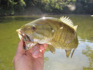 I caught several fish along the way, nothing more than about 13 inches…that is until I came to the first deeper hole. I could see tons of fish loaded up at the head of the pool; many were ‘rough’ fish, shad, suckers, buffalo, etc…in fact, there were even several nice catfish at the head of the pool…but through the years I have grown better at identifying my target and there in the middle of the flock was one nice smallie.