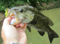 I was fishing a small section of creek that wasn’t very wide and had caught one fish after another; mostly smallies that were about 10 to 12 inches with a couple 14’s thrown in. Many of the trees were overhanging the stream and occasionally I could see that fish were rising and feeding on bugs or critters that were dropping in the water. I decided to tie on a green inch worm fly…that I tied onto my 3 weight fly rod. I made a nice false cast and then landed my little bug under an overhanging limb and allowed the inch worm to sink. I felt a tug and strip set my line with my left hand and saw that I had landed a small (6 to 7 inch) spotted bass. No offense to the spotted bass but I usually quickly strip these smaller fish in so that they don’t mess up any larger fish that might be in the pool. As I jerked this fish across the pool towards me a large smallie attacked my fish. To say that it was violent would be an understatement! The big fish continued to bash the smaller fish, driving him into the weeds and for a moment I couldn’t see either fish.