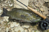 Once again I stripped the small fish out of the weeds and Mr. Big attacked with incredible speed, driving the small fish back into the weeds for the second time. A third time I stripped the fish loose and the large smallie approached from the front and engulfed my fish head first…all I could see was a little piece of tail sticking out of its mouth. I was momentarily stunned by what I had just seen but as the big fish started to amble back towards the pool I knew I had only one chance; I stripped the line with my left hand hard enough to pull the fly loose from the little fish and hooked the big fish! I didn’t know if it would work and for sure luck played a big part…but there I was, attached to the big fish and it was not happy at all. The fish now took me and my 3 weight upstream and I followed. I got the fish on my reel and knew that if it was indeed hooked well I could land the fish.